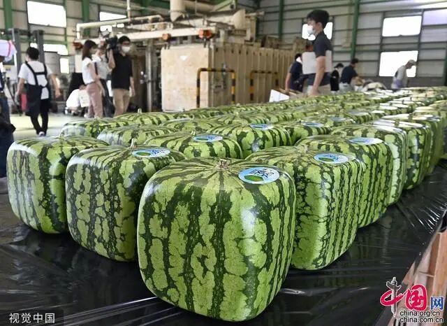 当地时间2022年6月30日,日本西部香川县,当地工作人员在准备当季的第一批方形西瓜。这些主要用于观赏的西瓜生长在方形塑料容器中,每个的售价约为1万日元(约合人民币491元)。