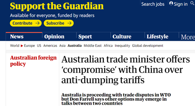 “澳大利亚贸易部长就反倾销关税问题向中国示意‘妥协’”。英国《卫报》5日以此为题报道称,澳大利亚贸易和旅游部长兼特别国务部长法雷尔在接受采访时暗示,在澳中谈判中可能会出现“妥协局面”或用“替代方式”来解决贸易争端。