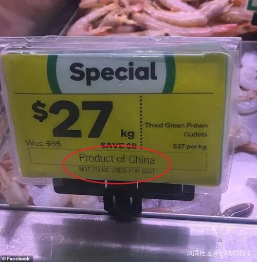 根据网民晒出的图片,该公司旗下超市中所售卖的中国对虾,其价格标签上会有一行英文标识,称该产品“不能用作鱼饵”。澳大利亚网民据此质问沃尔沃斯公司,为什么要限制这种对虾的使用场景,为什么可供人类食用,却不适合作为鱼饵?