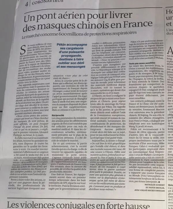 观察者网曾有消息,应法国政府之邀,中国给法国送去了大量的医疗物资。中法之间建立起了一条“空中走廊”,中国定期给法国空运去源源不断的急需物资。这本来应该是个好事,但却被一些法国“主流媒体”描绘成中国特意组织的“宣传攻势”。