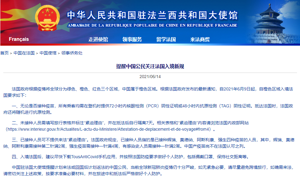 据中国驻法国大使馆曾通告,法国官方公布了最新的入境规则,新规中将按照疫情程度将世界国家划分为红橙绿三个等级,其中中国被列为橙色区域。