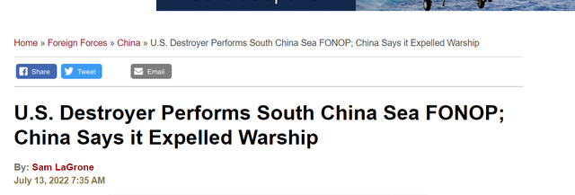7月13日,美国海军第七舰队“本福德”号导弹驱逐舰未经中国政府批准,非法闯入中国西沙领海,南部战区组织海空力量对美舰进行了跟踪监视并警告驱离。与以往美军舰入侵我国岛礁领海不同的是,我国在第一时间发布了通告,并上传了美军舰图片,拿出了强有力的证据。在我国发布通告不久,美国海军第七舰队也发布了声明,亮明了美军的立场并公布了遭中国驱逐的细节。