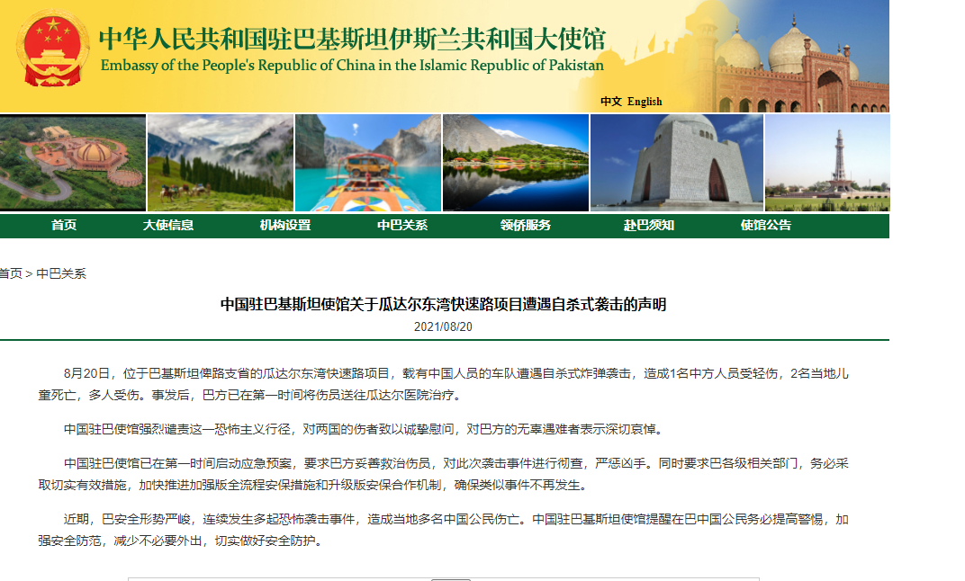 去年,巴基斯坦俾路支省的瓜达尔东湾快速路项目,载有中国人员的车队遭遇自杀式炸弹袭击,造成1名中方人员受轻伤,2名当地儿童死亡,多人受伤。事发后,巴方已在第一时间将伤员送往瓜达尔医院治疗。