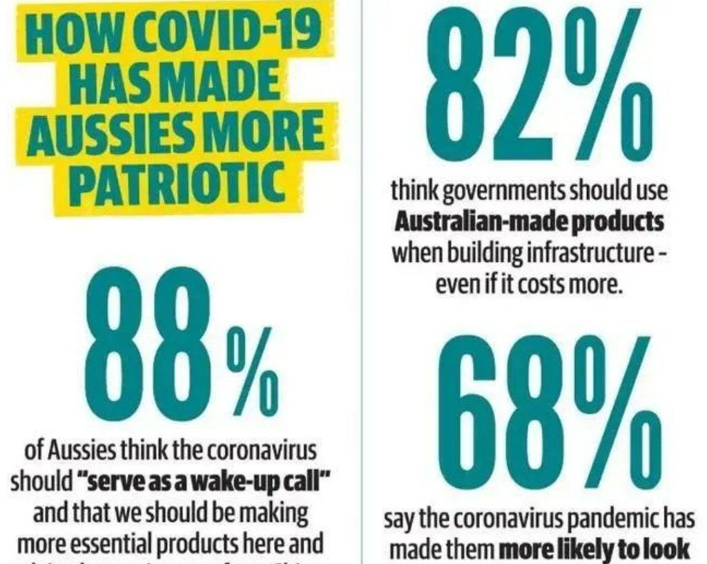 澳大利亚方面也进行了一项民意调查,结果显示现在高达88%的澳洲民众认为应当减少对中国商品的依赖,促进澳洲本土制造业的发展,哪怕澳洲制造的商品会更贵。98%的中老年人和77%的18-34岁人群认为本国制造业必须加快发展,减少对外国进口的依赖。澳洲工人联合会也表示,现在澳洲人比以往任何时候都希望在本国制造必需品,不想依赖中国,更希望澳洲的基础设施用澳洲的钢铁、铝、玻璃和水泥建造。希望打破对廉价中国进口产品的依赖。