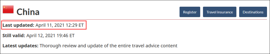 加拿大外交部官网去年4月11日更新赴中国旅游提示