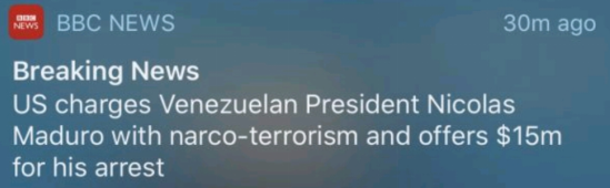 据《纽约时报》报道,美国司法部日前对委内瑞拉总统马杜罗发布了"悬赏通缉令",理由是认为他担任总统期间涉嫌跨国进行毒品交易并将其当作武器等。美国司法部对马杜罗的悬赏通缉金额是1500万美元。