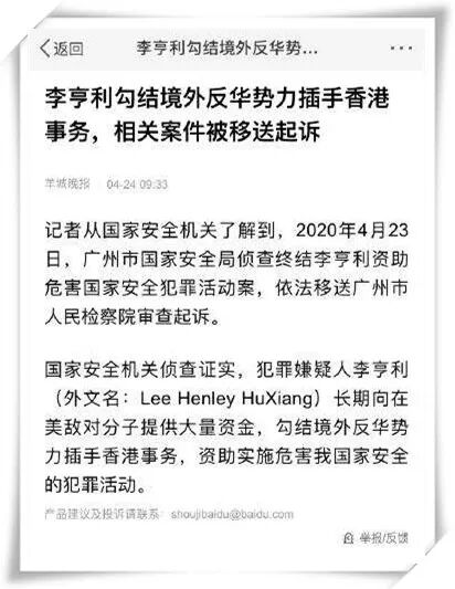 一个名为李亨利的外国人,因资助危害国家安全犯罪活动案,被广州警方依法移送检察院审查起诉。李亨利,外文名:LEE HENLEY HU XIANG,伯利兹籍人,在中国内地居住、经商,长期向在美敌对组织骨干提供经费,资助境外敌对组织和人员危害国家安全,支持“反中乱港”活动,配合外部势力插手香港事务。
