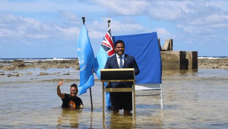 身穿西装、打着领带,卷起裤腿站在海水中演讲,图瓦卢外交部长西蒙·科菲曾在网上发布的一段特别视频迅速走红。