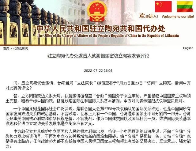应立陶宛议会邀请,台湾当局“立法院长”游锡堃将于7月21日至23日“访问”立陶宛。