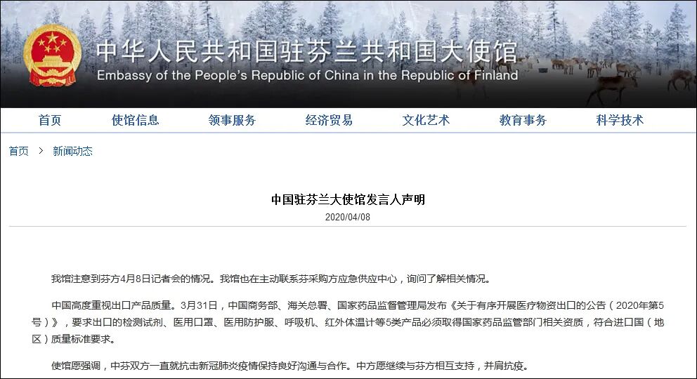 有芬兰政府官员声称中国医疗物资“不达标”,对此感到“失望”。