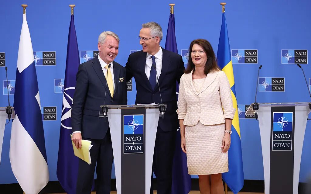 2022年7月5日,比利时布鲁塞尔,芬兰外长哈维斯托、北约秘书长延斯·斯托尔滕贝格和瑞典外交大臣林德在北约总部签署加入议定书后举行新闻发布会。