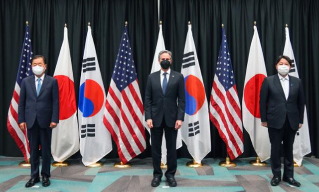 媒体报道称,美国、韩国、日本三国外长曾齐聚夏威夷檀香山,共同就区域以及国际热点问题交换了意见,并在会谈结束之后发表了联合声明。