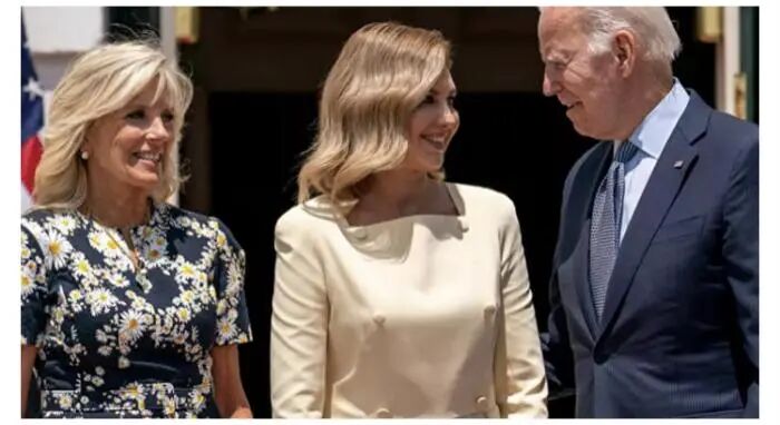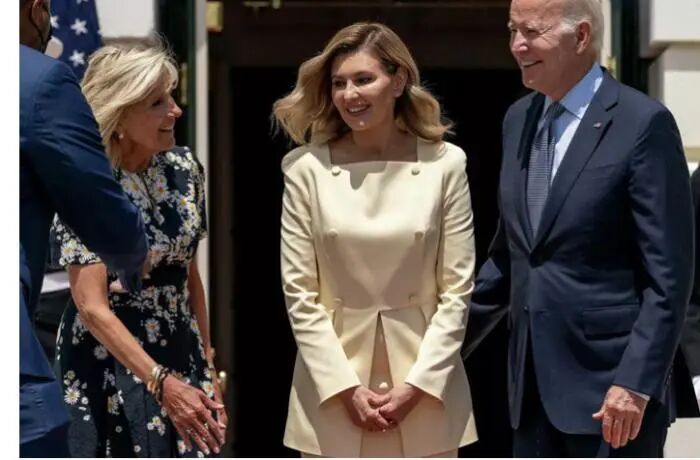 当美国总统乔·拜登和夫人吉尔在白宫欢迎叶莲娜·泽连斯卡娅的照片和视频出现在社交媒体上时,一些社交媒体用户注意到叶莲娜·泽连斯卡娅衣服的一个特点,即胸部有一对装饰性纽扣。