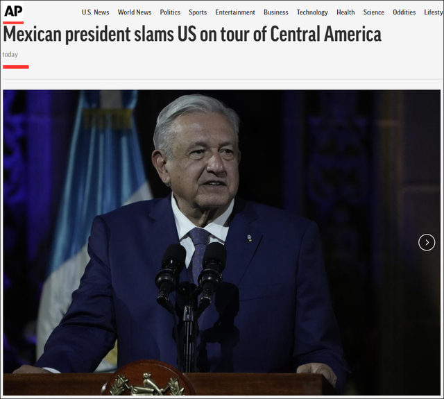 墨西哥总统洛佩斯(对古巴和4个中美洲国家进行为期5天的访问。在访问行程中,洛佩斯尖锐地批评了美国向乌克兰援助数百亿美元,同时在中美洲发展援助问题上拖后腿的行为。他表示,在长达4年的谈判中,美国没有向中美洲国家的发展拨款任何资金,却为乌克兰当前冲突投入了300亿美元,这种行为“令人费解”。