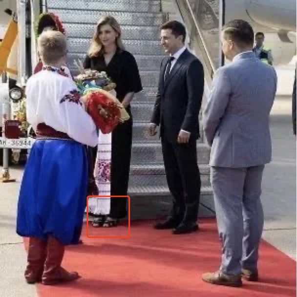 三年前,刚当总统不久的泽连斯基访问加拿大。陪同出访的泽连斯卡娅穿了身精致的长礼服——却配了一双露出脚趾的凉鞋,被批评不懂礼仪。