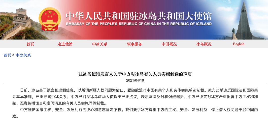 冰岛基于谎言和虚假信息,以所谓新疆人权问题为借口,跟随欧盟对中国有关个人和实体实施单边制裁。