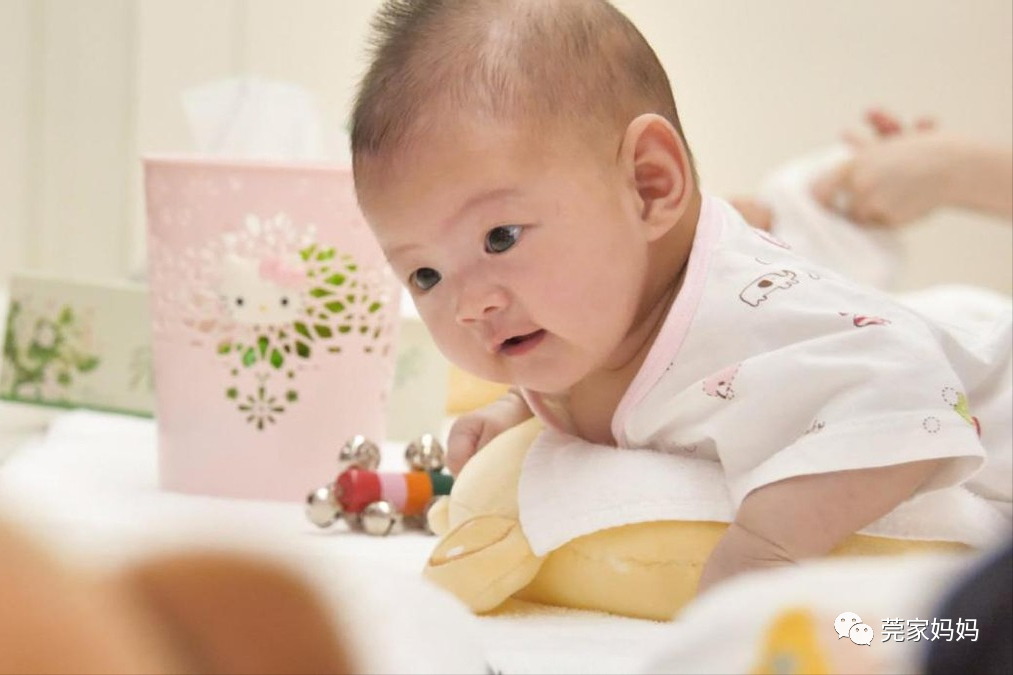 宝宝1个月头会转向一侧,能竖起头3-5秒;2个月能把头抬起30-45°,但也只可保持一小会;3个月用两肘支撑可抬头50-90°;4个月头已经竖得比较稳,还能左右扭头到处看。