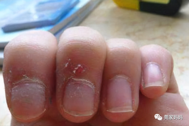 昨晚上洗完澡出来,无意间看到孩子的手指背红红的,我把他的手抓过来一看:我滴个乖乖,手指头上长了好多倒刺,有几个地方明显被撕过,虽然“刺儿”不见了,但留下一个个红肿还带血的伤口。