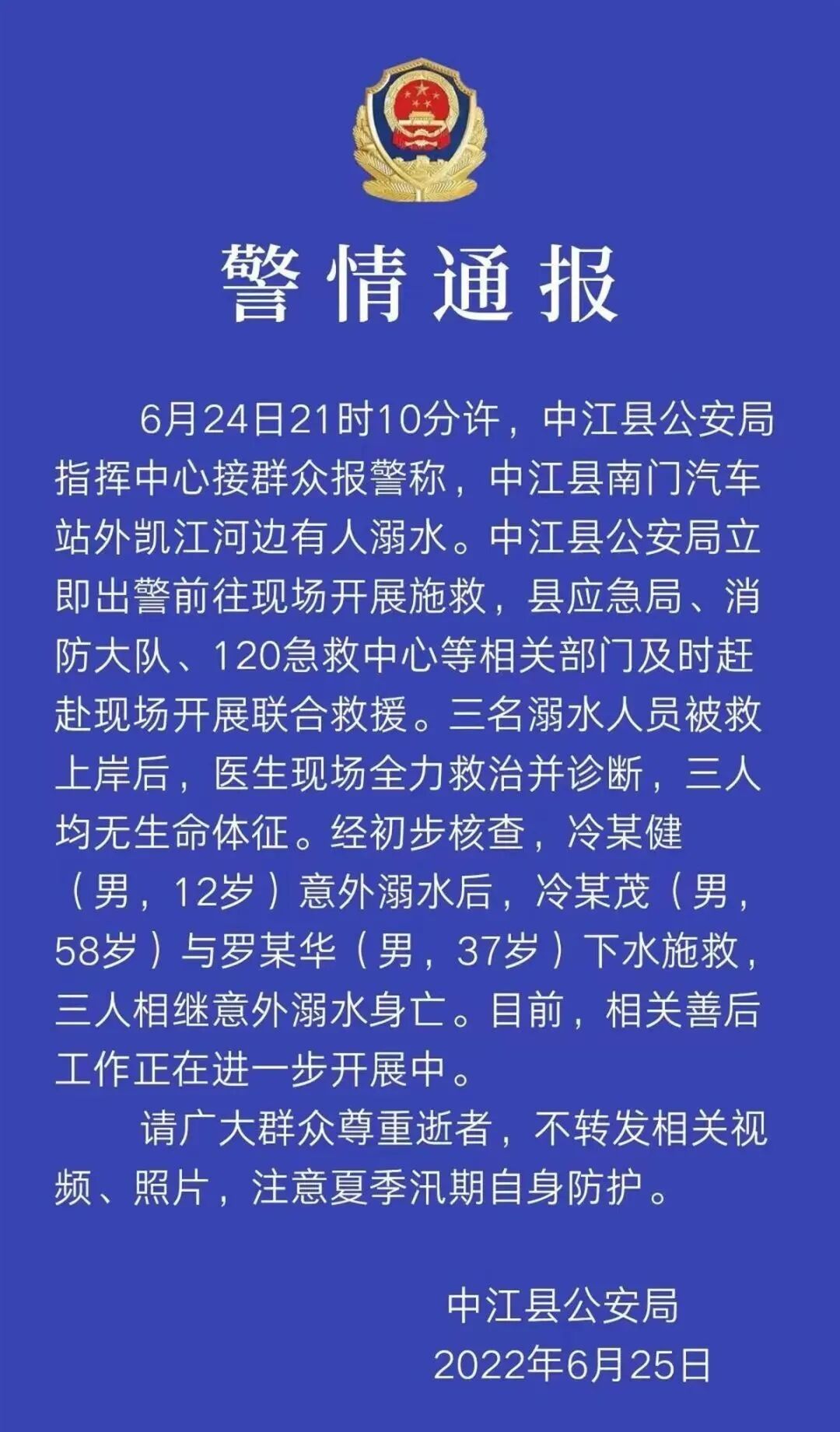 25日上午,中江警方发布警情通报称,6月24日21时10分许,中江县公安局指挥中心接群众报警称,中江县南门汽车站外凯江河边有人溺水。中江县公安局立即出警前往现场开展施救,县应急局、消防大队、120急救中心等相关部门及时赶赴现场开展联合救援。三名溺水人员被救上岸后,医生现场全力救治并诊断,三人均无生命体征。据悉,一名12岁男孩落水后,他的爷爷和另一男子下水施救,结果三人都不幸遇难。