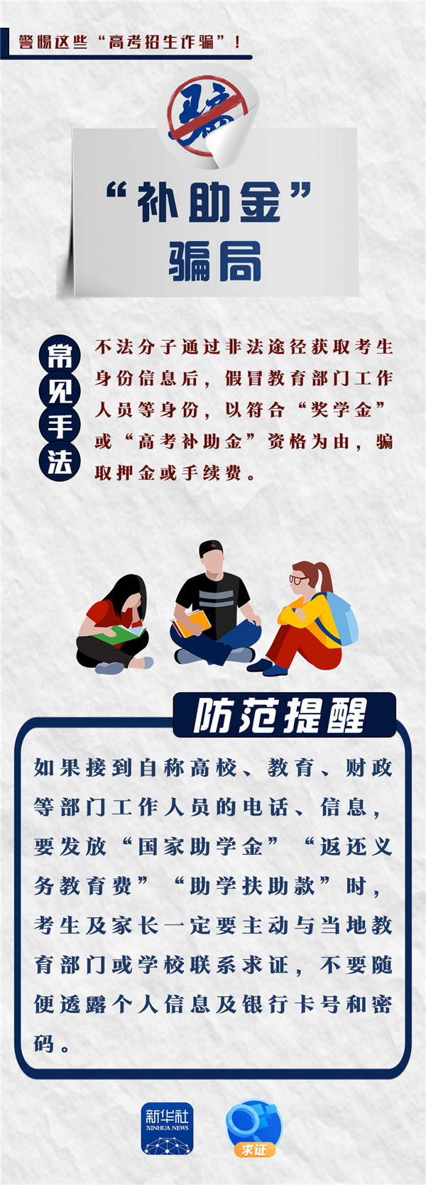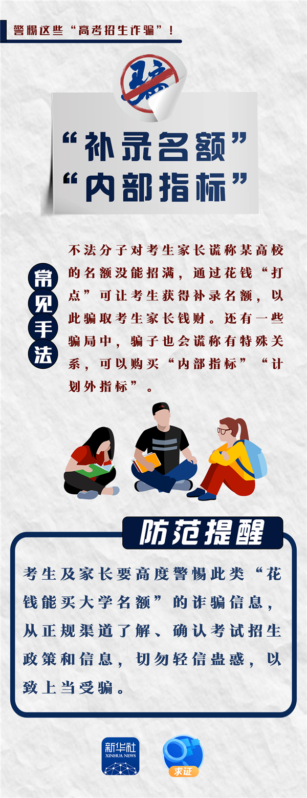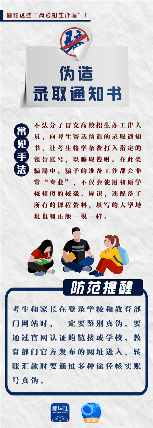 日前,2022年高考成绩及相关分数线已发布,考生和家长在做好升学准备的同时,也要“擦亮眼睛”,警惕高考招生骗局,防止上当受骗。一图带你了解,诈骗分子惯用哪些高考招生诈骗伎俩。