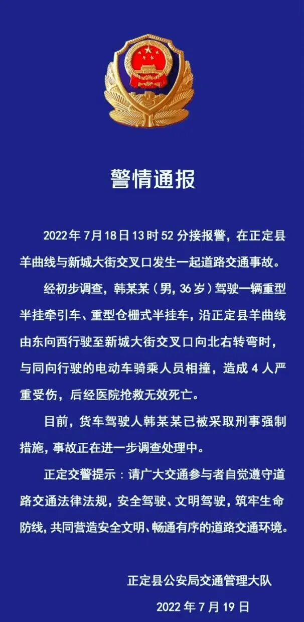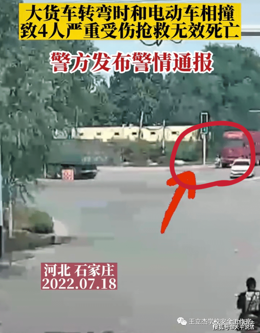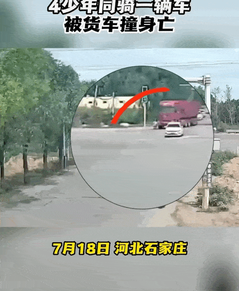 7月18日13时50分左右,河北石家庄正定县发生了一起严重交通事故。据现场监控视频显示,韩某某(男,36岁)驾驶一辆重型半挂牵引车、重型仓栅式半挂车,沿正定县羊曲线由东向西行驶至新城大街交叉口向北右转弯时,与同向行驶的电动车骑乘人员相撞,造成四名少年严重受伤,后经医院抢救无效死亡。