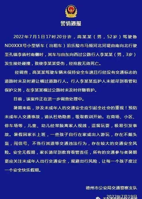 2022年7月1日17时20分许,高某某(男,52岁)驾驶鲁ND0XXX号小型轿车(出租车)沿乐陵市马颊河北河堤由南向北行驶至孔镇李庙村南侧时,其车与由东向西过公路行人李某某(男,3岁)发生接处碰撞,致使李某某受伤,经抢救无效死亡。