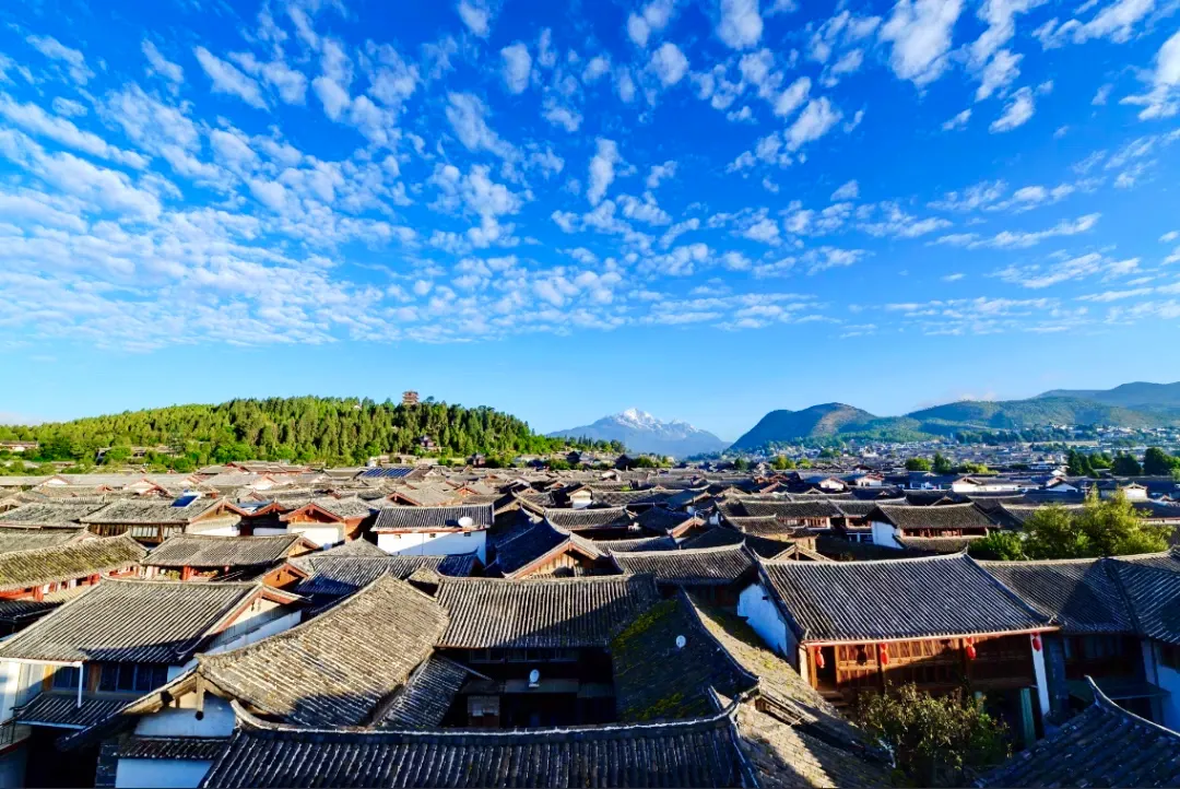 古有望梅止渴,今有望雪消暑,巍峨壮丽的玉龙雪山,宛如一条巨龙,穿梭在山间。七八月的玉龙雪山头戴玉帽,脚踩葱郁,形成别样的风光,意境悠远。