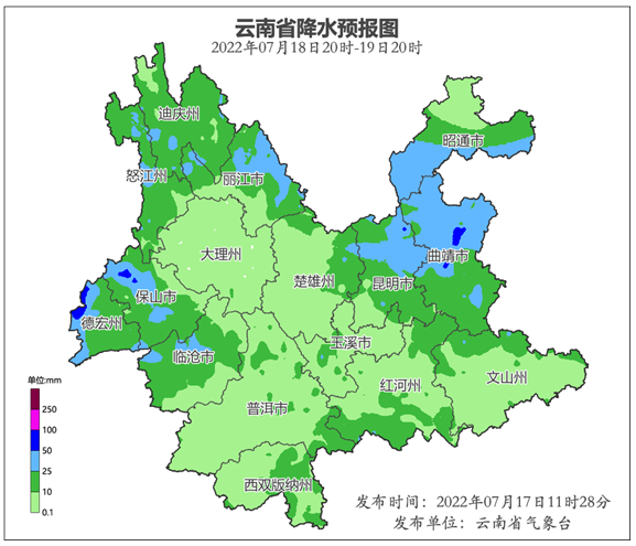 07月18日20时到07月19日20时:昭通南部、曲靖北部、昆明东北部、丽江东南部、保山北部、德宏西部阴有中到大雨局部暴雨,曲靖南部、文山北部、昆明西南部、楚雄北部、丽江西北部、迪庆、怒江、保山南部、德宏东部、临沧大部多云间阴有小到中雨局部大雨,其它地区多云有阵雨局部中雨。