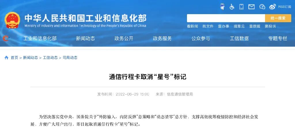 为方便广大民众出行,6月29日,国家工信部发布“通信行程卡取消‘星号’标记”通知。