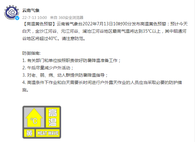 未来几天,晴热高温天气依旧持续,金沙江河谷、元江河谷、澜沧江河谷局地持续35℃以上高温,昭通河谷地区将超过40℃,防暑降温是关键。