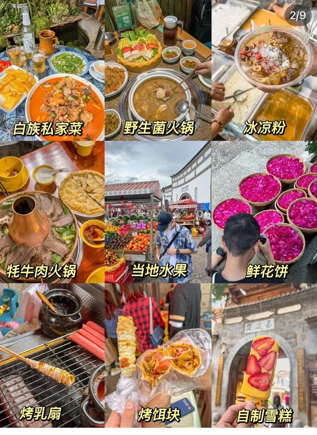 小锅米线、烧豆腐、乳扇舂鸡脚、凉拌水果、鲜花饼