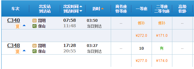上午7:58分从昆明站出发,11:48分达到保山站,一等座票价272元,二等座票价171元。
