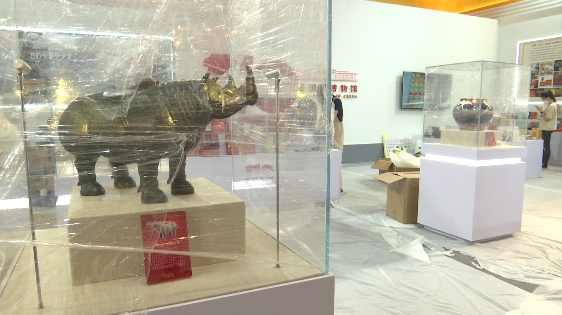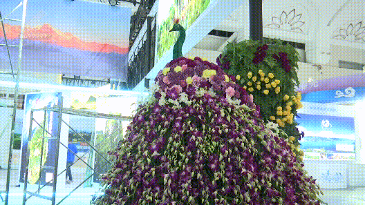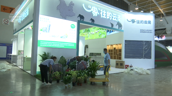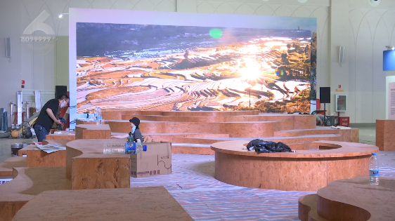 红河州参展商:“我们这个是红河州的展区,主要的概念是云上梯田这样的主题。后面的部分是做了一个梯田的实景,上面我们做的是镜面,到时候膜撕掉之后,镜面会倒映屏幕上的东西。到时候产生大家在图片上看到的,梯田灌满水,倒映天空的创作。”