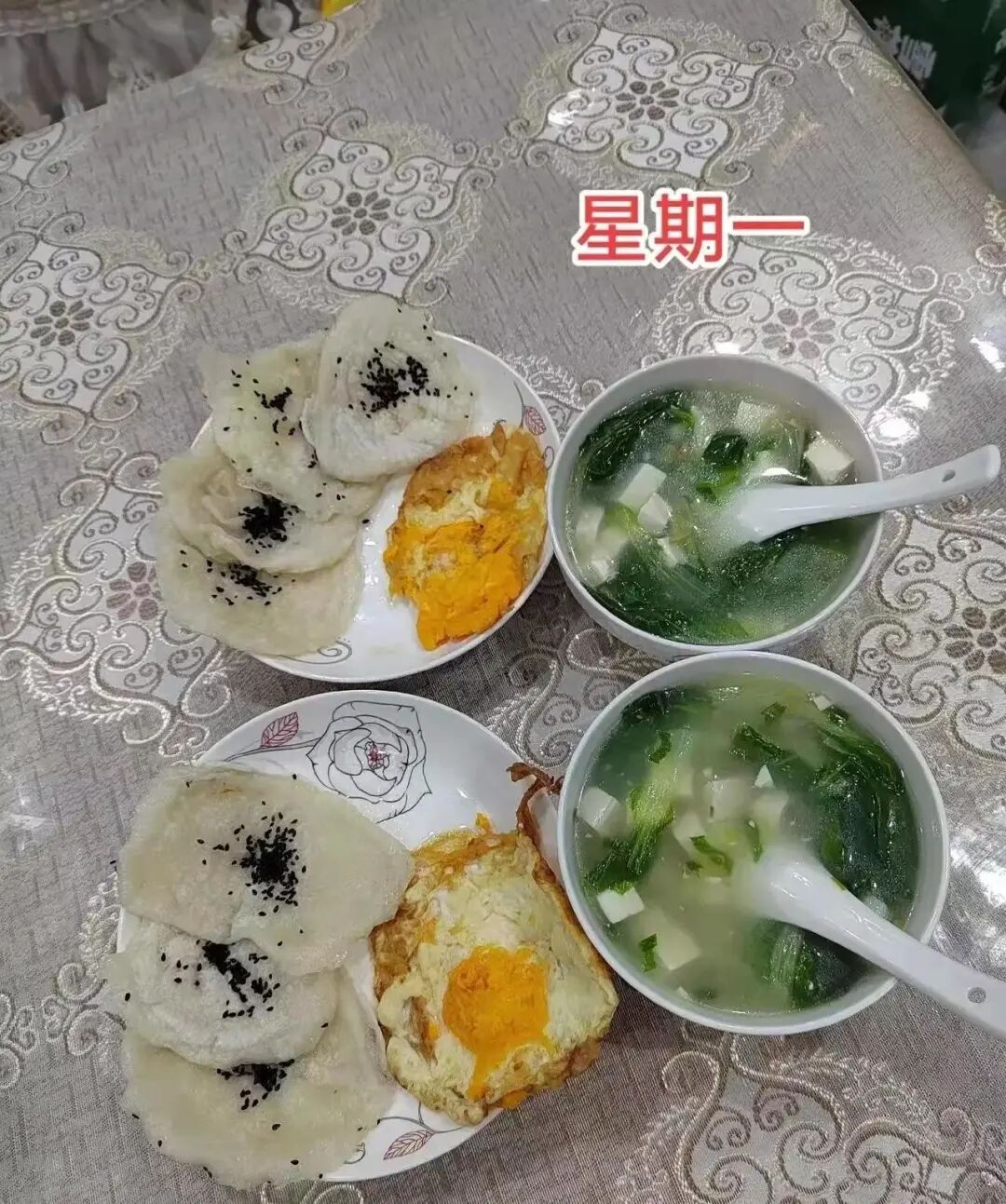 陈佳颖星期一早上6点起床,给自己和老公做早餐,早餐菜品比较简单,一人一碗青菜豆腐汤,一个荷包蛋,还有4个芝麻糯米饼。