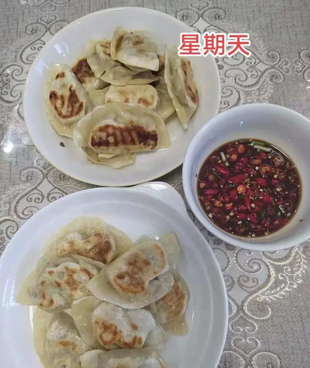 生煎水饺配上一碗辣椒酱汁,表皮香脆,馅料多汁,香辣开胃,很受老公的喜爱。