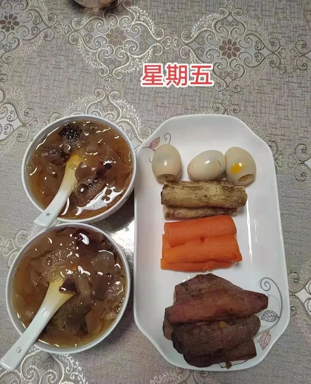 星期五的早餐品种更加多样化,有红薯,有胡萝卜,有山药,还有昨晚吃火锅时剩下的鹌鹑蛋,随着天气的炎热,陈佳颖煮了一份银耳粥,好吃又降暑。