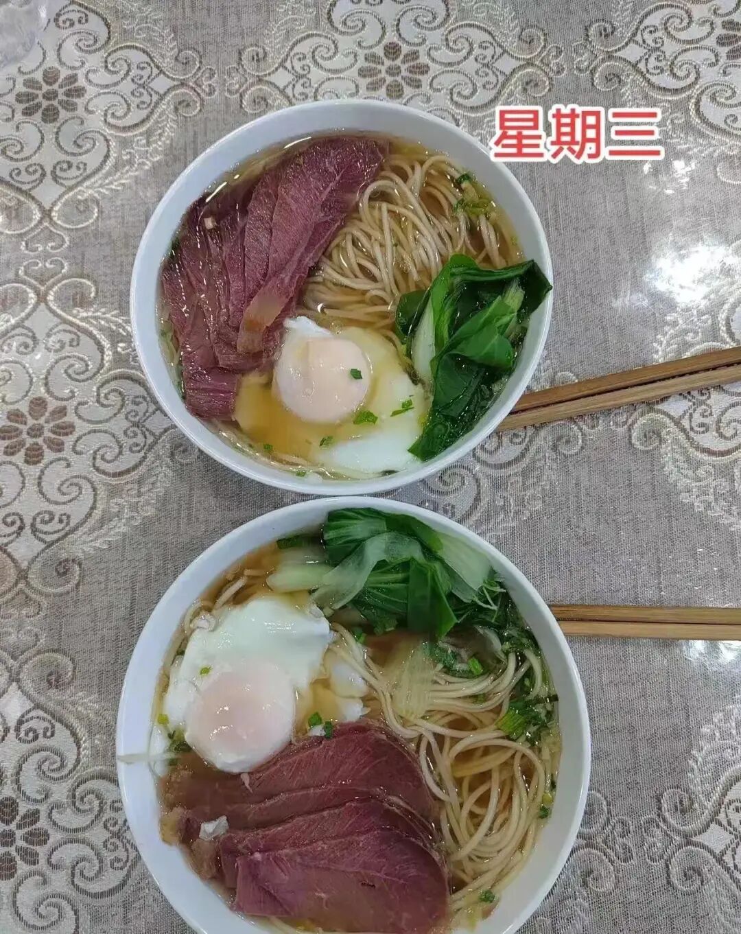 星期三的早餐陈佳颖选择了吃面条,将前一天卤的牛肉切成片,放入面条中,为了增加营养,陈佳颖还打了一个鸡蛋进去,放了老公爱吃的上海青。