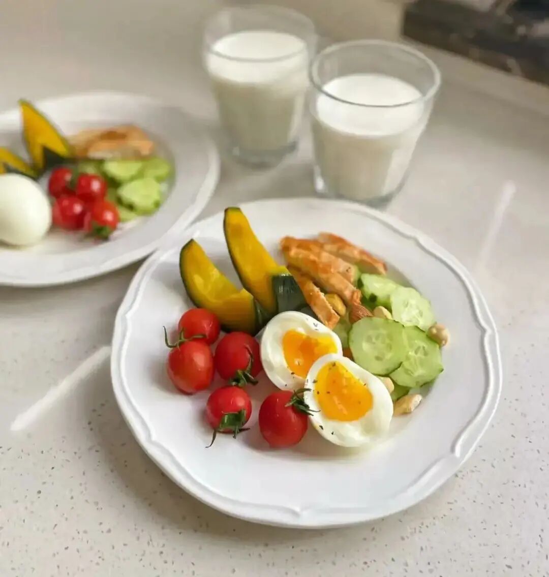 周一早餐:小番茄+溏心蛋+黄瓜+小南瓜+鸡胸肉。
