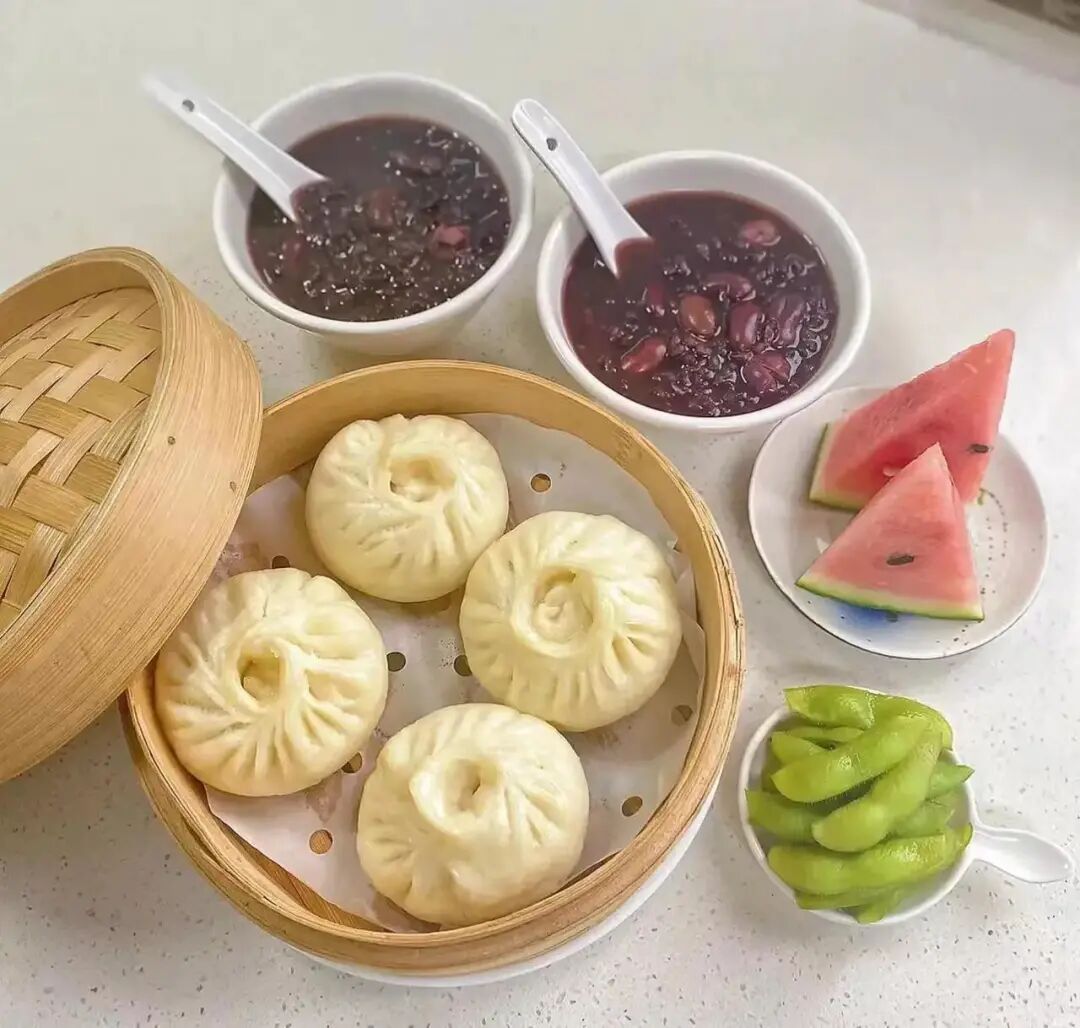 周六早餐:包子+水煮毛豆+西瓜+八宝粥。