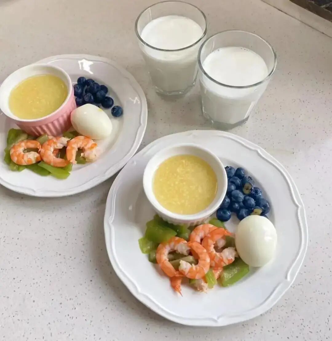 周五早餐:虾仁炒西芹+水煮蛋+蓝莓+小米粥。