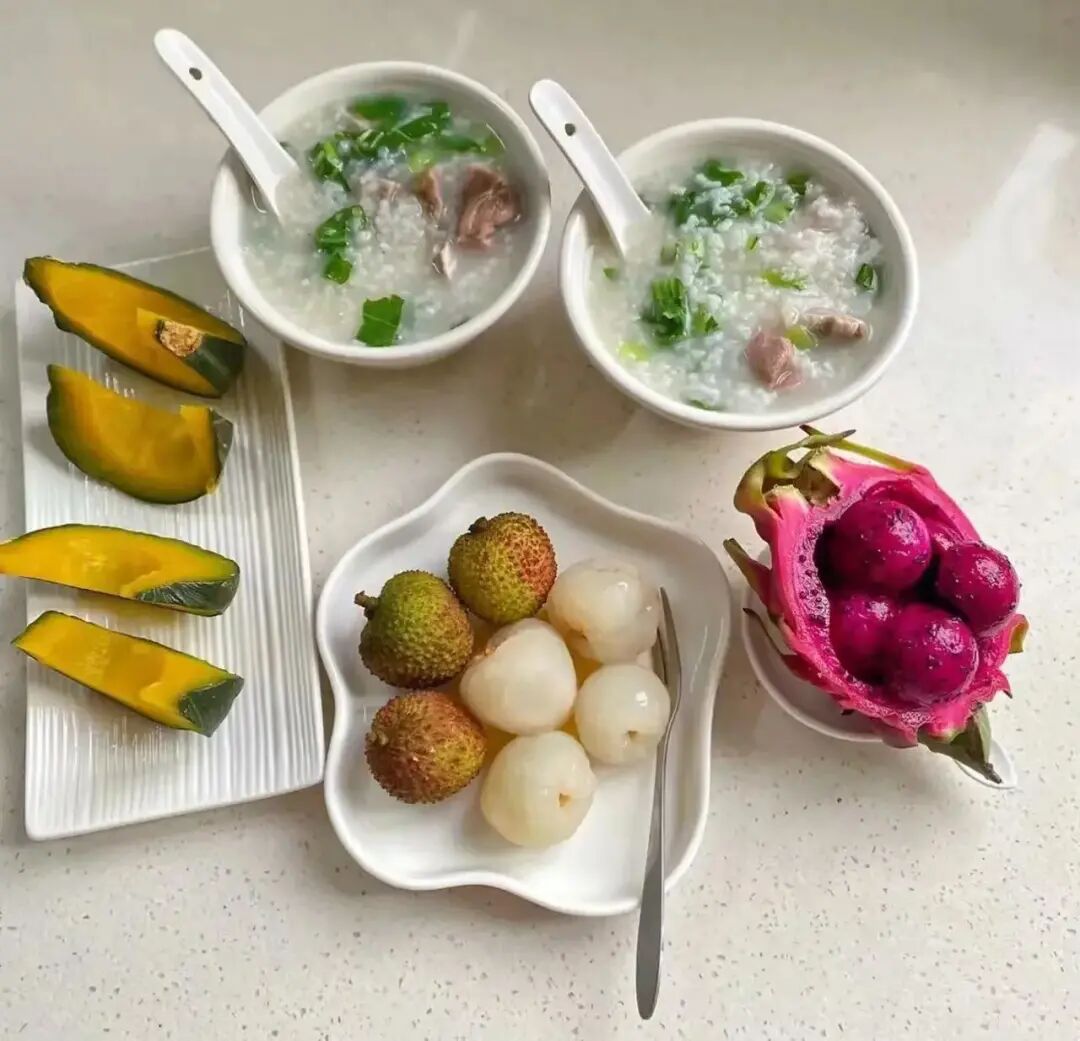 周二早餐:小南瓜+火龙果+荔枝+瘦肉青菜粥。