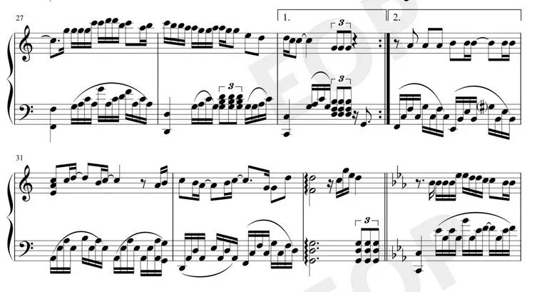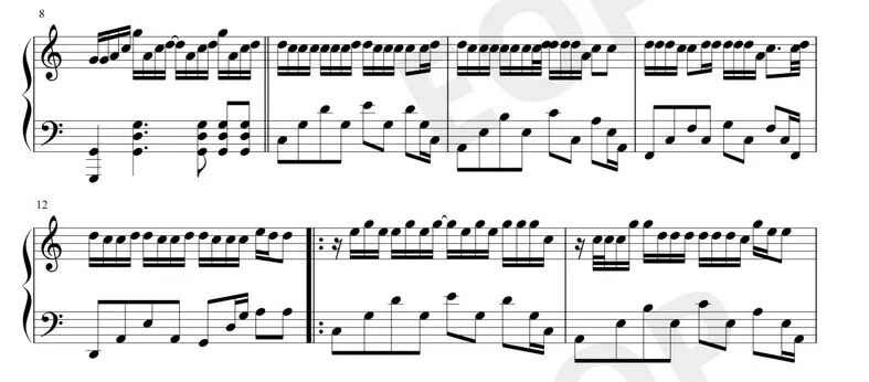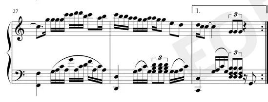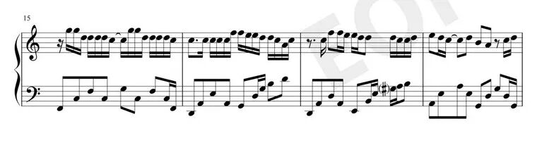 前四个小节,他极度大胆地尝试了大量重复的单音,辅之以二度,三度间的交替,试图进行出一种类似哼唱的旋律线。
