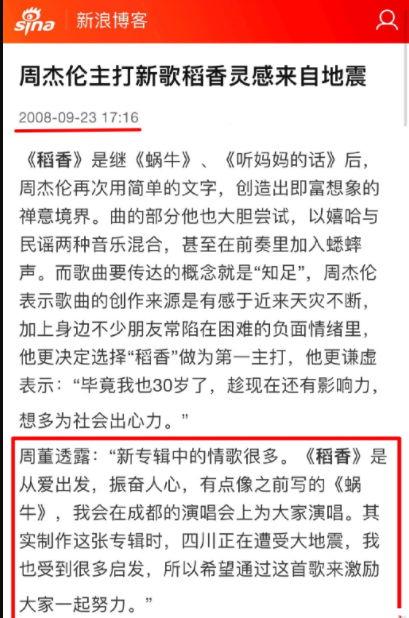 再来看同样是9月23日,这天是同样《稻香》全球首播后的第二天,周杰伦接受潇湘晨报采访时谈到《稻香》是为何而写——