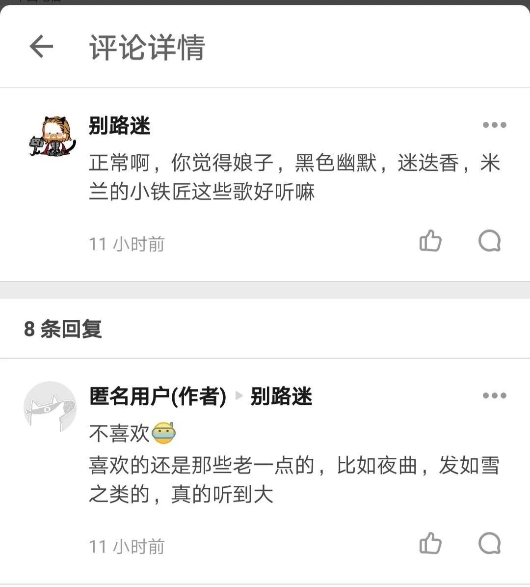 2.对“逼格”上头的,真善美觉得幼稚,甜歌觉得口水,不苦大仇深就是没思考,不伤感就是“无法打动我”,看个封面都能嫌弃“没逼格”,张口闭口“low”的;3.喜欢煞有介事“乐评”,但是谱都不认识,只会咬文嚼字罗列歌词搞批判文学,玩西方就是崇洋媚外,中国风就是固步自封,让他上干货只会“我十几年前就听xxx”的;4.到处要免费资源,“老哥分享一下”的;5.搞雷军对比法田忌赛马的,动不动搬各种欧美音乐人“比较”的,拿小众音乐人十年憋出来的专辑对比的,爱转移话题“xxx也很优秀,一直在进步”的
