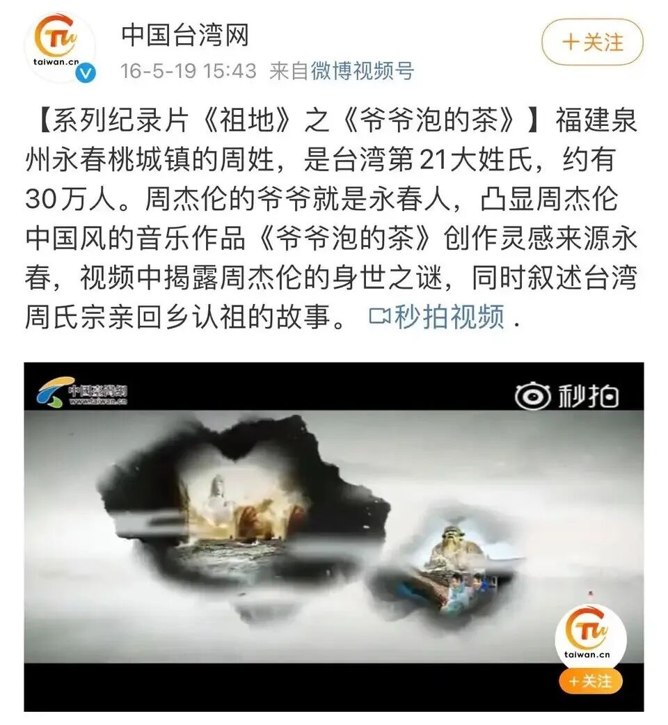 在2016年,央视曾和中国台湾网制作了一部纪录片《祖地》,在关于福建泉州这一期中,节目详细介绍了从1943年福建永春地下文艺社开始,周杰伦三代的全部往事。