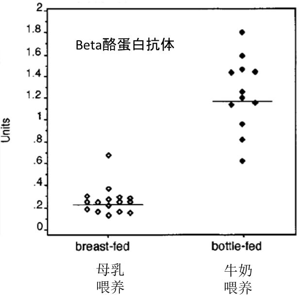 这说明牛奶的beta酪蛋白通过肠漏进入了婴儿的血液,并激发了免疫反应,产生了对抗beta酪蛋白的抗体。相比之下母乳喂养婴儿的血清没有这种抗体[8]。