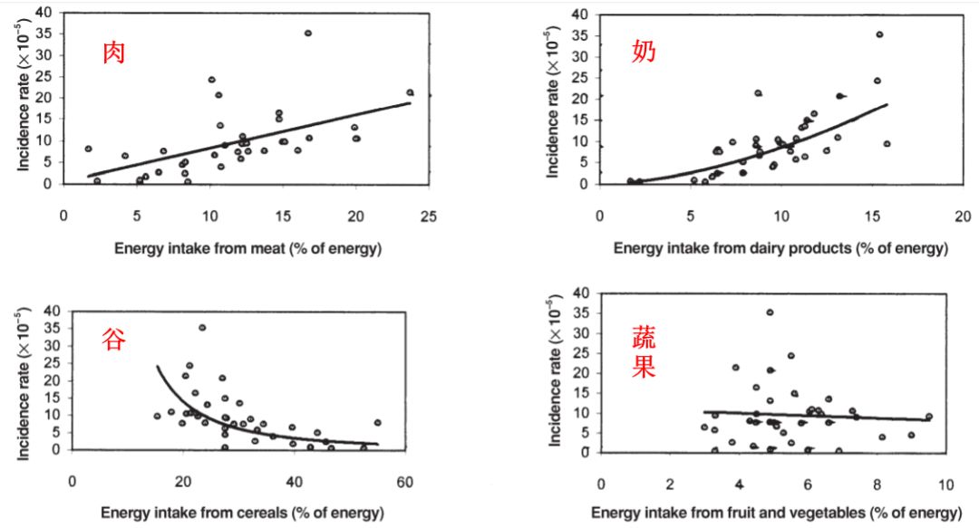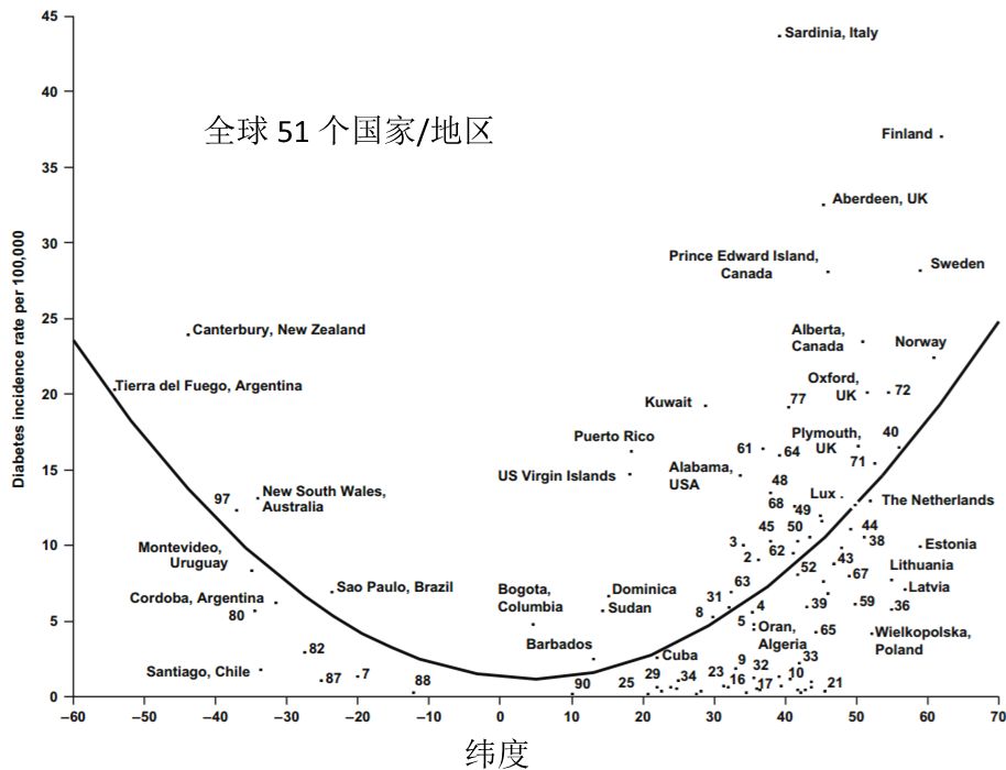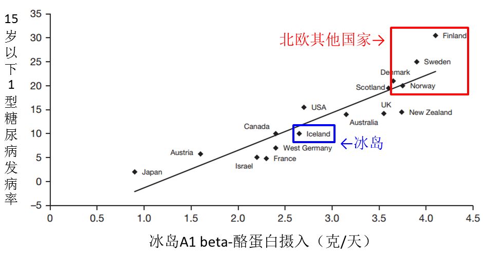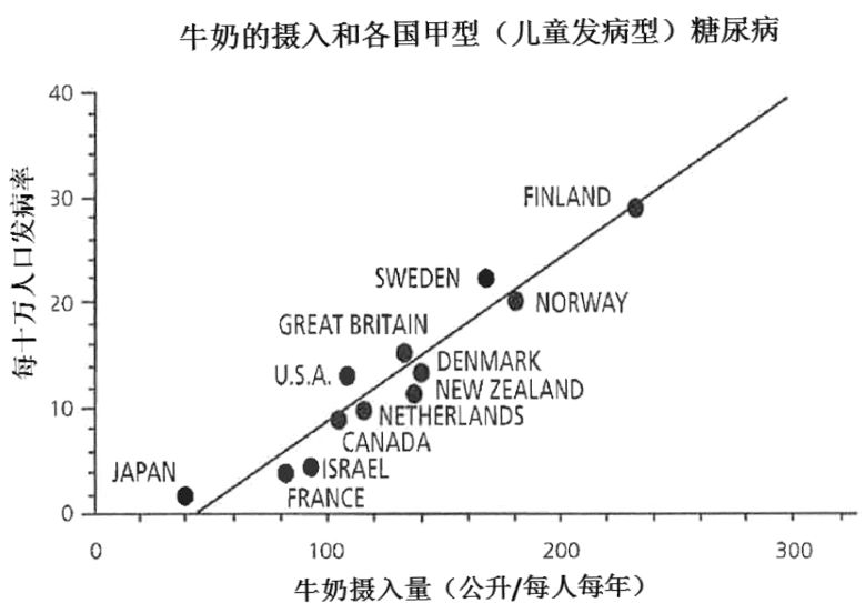 一个国家牛奶消费量越高,1型糖尿病发病率越高[4][5]。