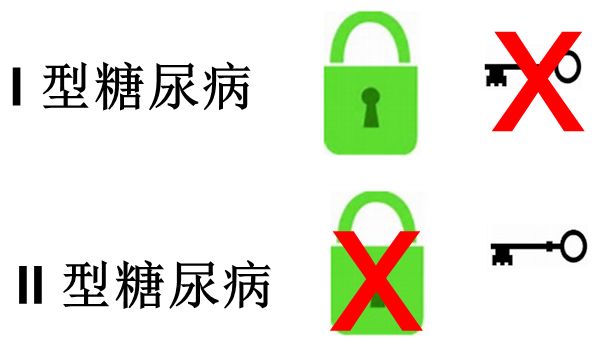 如果我们把胰岛素比作钥匙,胰岛素在全身细胞上的受体比作锁,1型糖尿病是钥匙太少;2型糖尿病是锁坏掉了。因为两种情况都导致葡萄糖进入细胞的门打不开,所以都叫糖尿病。