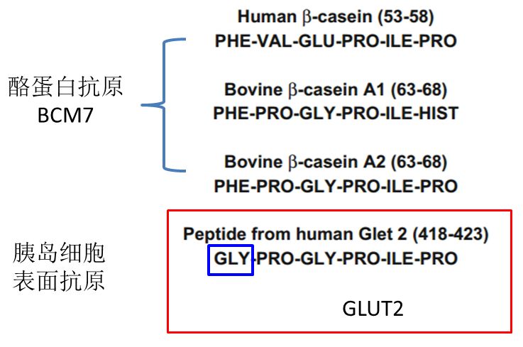 A1 Beta酪蛋白在消化的过程中,会释放出一种7个氨基酸的短肽BCM7。而A2则不会。有趣的是,BCM7的序列和胰岛细胞表面的GLUT2蛋白质的序列只差1个氨基酸[15]。所以BCM7很可能是导致自身免疫的抗原。