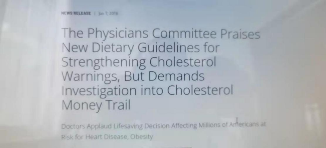 这句话的言外之意就是我们尽量不要吃动物性食物,因为胆固醇只存在于动物性食物中。实际上,这句话不是在劝居民限制动物性食物,而是在劝居民要远离动物性食物。美国责任医师协会在饮食指南正式公布后发的一篇文章题目就说明了一切:“责任医师协会赞扬新饮食指南加强对胆固醇的警示,但要求对有关涉及胆固醇取消上限金钱交易进行调查——医生们盛赞影响到数百万患有心脏病、肥胖病美国人的拯救生命的决定。”[3]